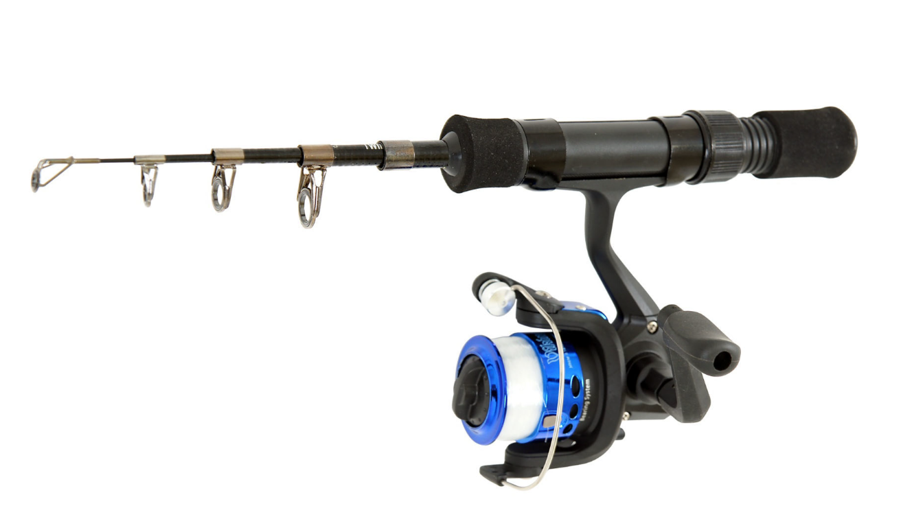Teleskopisk isfiskestang med haspelsnelle.